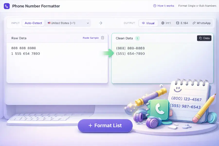 Format phone numbers into consistent, professional styles for websites, ads, or contact lists. Supports bulk formatting to save time on large lists.