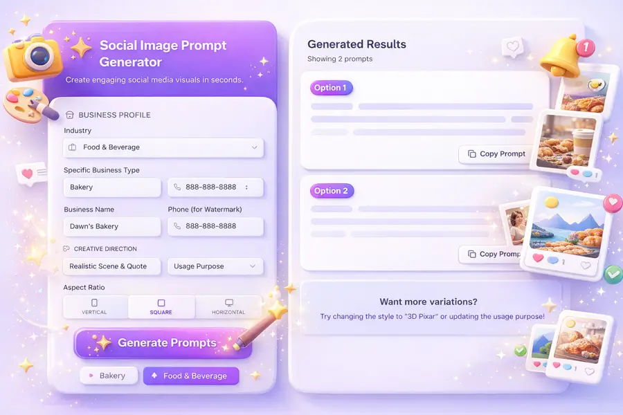 Create ready-to-use image prompts designed specifically for local promotions, offers, and announcements. Perfect for generating eye-catching visuals in any AI image tool without guesswork.